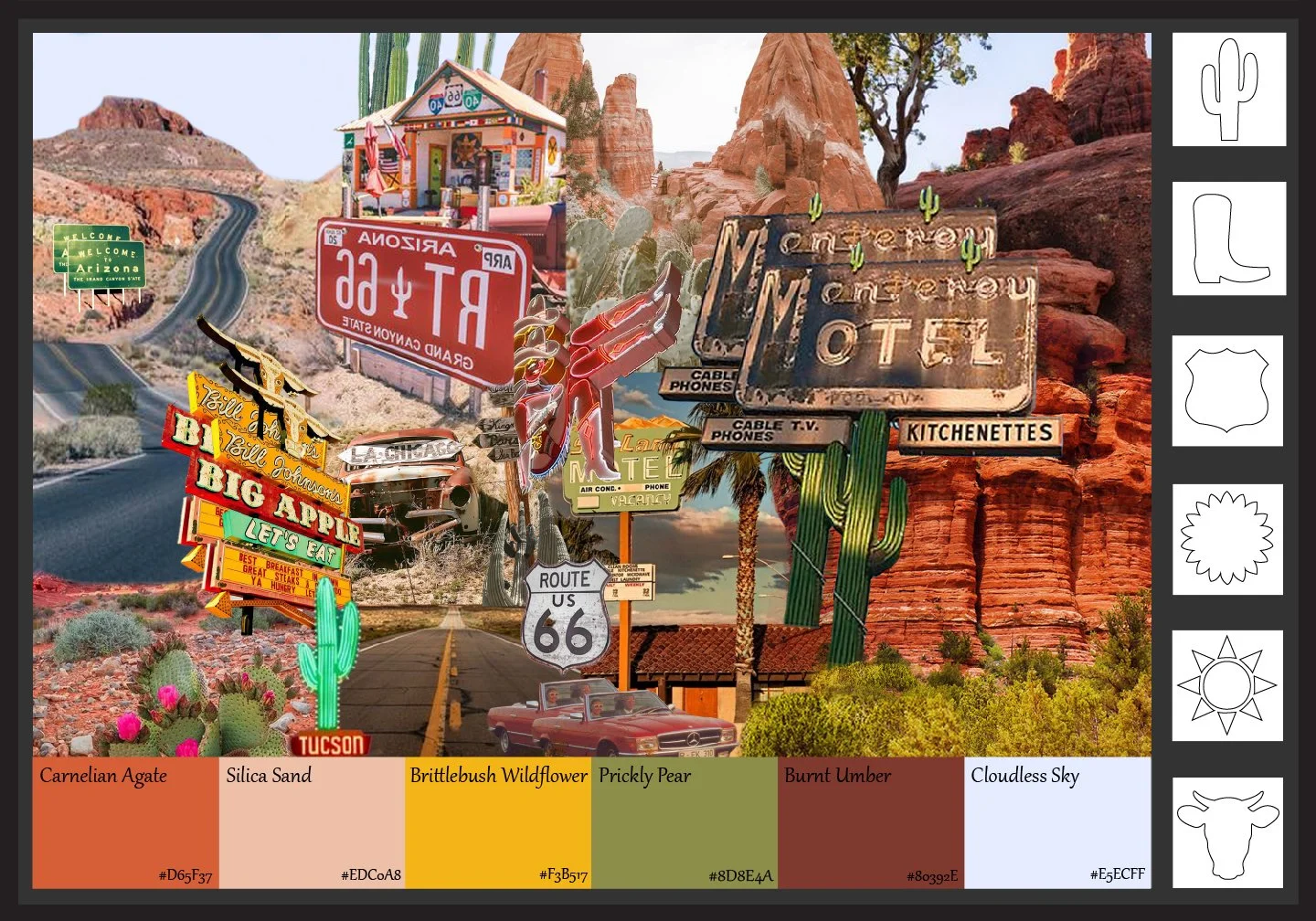 The concept board for this project served as the foundation for the entire collection. Featuring inspirational imagery, a cohesive color palette, and icons representing potential patterns, the board captures the essence and emotion evoked by Arizona.